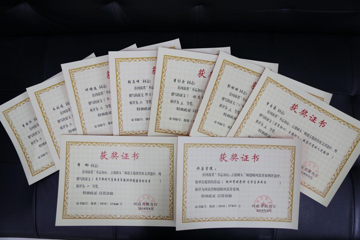 近日,河南省教育厅发布了《关于公布“不忘初心 立德树人”师德主题教育征文演讲比赛和优秀案例评选结果的通知》(教师〔2018〕793号),此次师德主题教育活动中,bet36体育在线荣获征文比赛一等奖1项,二等奖2项,三等奖3项和优秀案例奖1项。