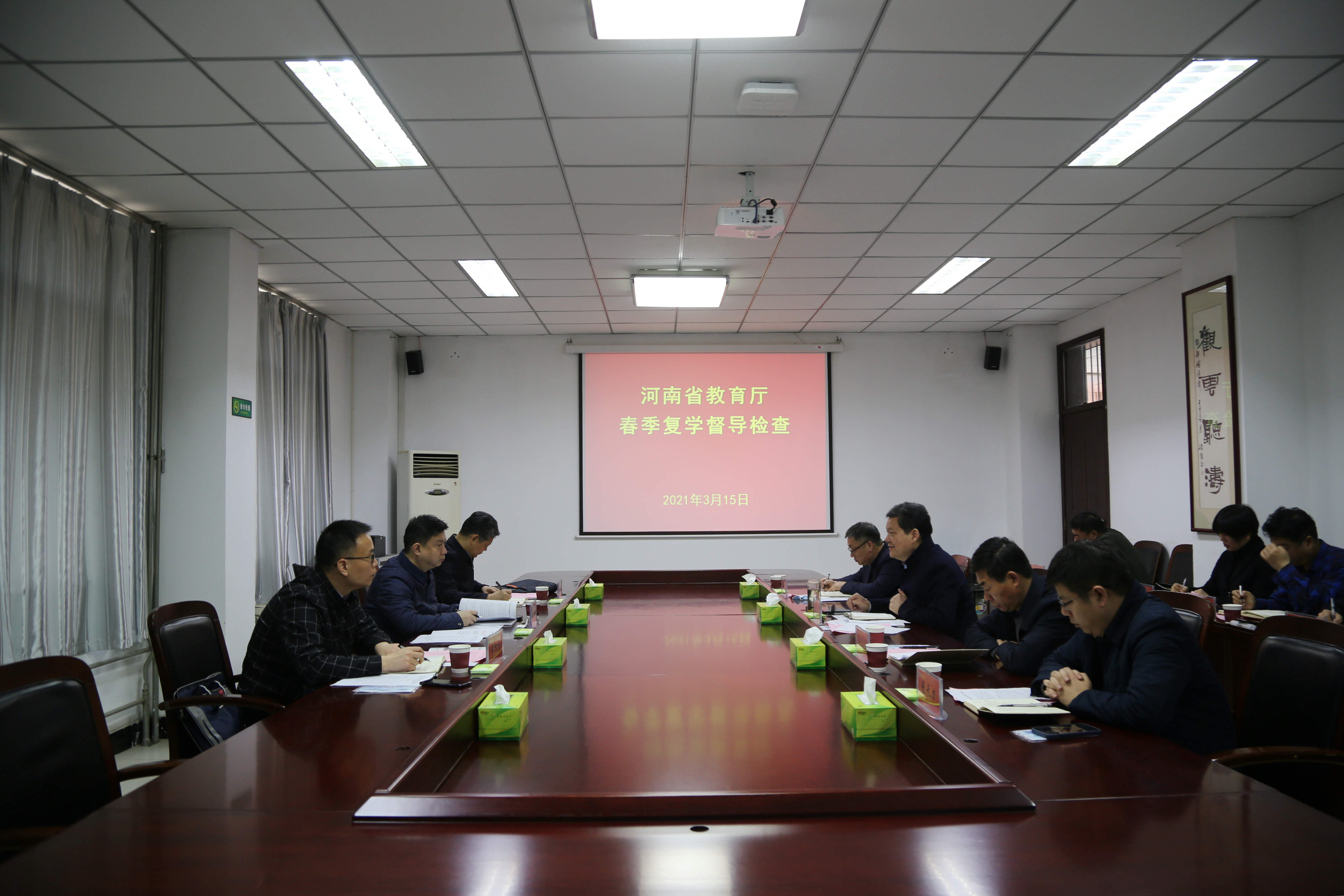 3月15日上午,省教育厅疫情防控专项督导组在省教育厅学生处处长李班带领下,一行三人到bet36体育在线检查指导2021年春季学期疫情防控工作,同时听取许昌职业技术学院、许昌电气职业学院、许昌陶瓷职业学院疫情防控工作情况。校党委书记闫纪建、院长岳修峰会见了督导组一行。督导检查汇报会在bet36体育在线办公楼第一会议室召开。bet36体育在线副院长高金星、许昌职业技术学院副院长杨富营、许昌电气职业学院副院长刘涛、许昌陶瓷职业学院副院长张长力出席汇报会。汇报会由副院长高金星主持。