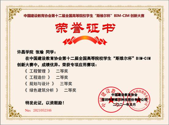 近日,第十二届全国高等院校学生“斯维尔杯”BIM-CIM创新大赛落下帷幕。由bet36体育在线土木工程学院崔阳阳、张瑜、王思远等十位同学组成的两支团队分别获得工程造价专项二等奖、绿色建筑分析专项二等奖、工程管理专项二等奖和规划与设计专项三等奖,黄春水、焦玲等教师获得优秀指导教师,bet36体育在线获得优秀院校组织奖。