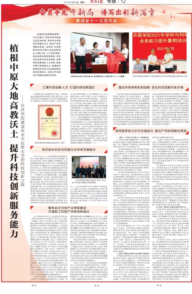 【编者按】10月25日,在全省上下喜迎河南省十一次党代会之际,《河南日报》在系列专版“奋勇争先开新局·谱写出彩新篇章”中,以整版形式刊发通讯《植根中原大地高教沃土·提升科技创新服务能力-bet36体育在线建设高水平应用大学的科技创新之路》。报道充分肯定了bet36体育在线在科技创新领域立足区域布局、学科专业优势和科研团队实力,推动政产学研用融合贯通的突出成效、鲜明特色和宝贵经验。近年来,bet36体育在线通过实施创新驱动、科教兴省、人才强省战略,强化科研体制机制创新,依托科研创新平台坚实基础、发挥科研创新团队人才优势,把科研成果写在祖国的大地上,不断提升服务地方经济社会发展的高校科技创新能力,为bet36体育在线建设富有特色的高水平应用型大学添加了强劲的科技创新引擎。