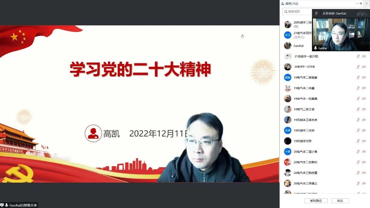 12月11日,电气与机械工程学院开展党的二十大精神宣讲活动,学院党委书记高凯以《学习党的二十大精神》为题,为近200名学生党员和入党积极分子上专题党课,深入阐述党的二十大的重大理论意义和实践意义,分析党的二十大报告提出的“一个中心任务”“两个行”“三个务必”“中国式现代化”等新论断,交流党的二十大报告体现的中国共产党的人民情怀、使命担当、全球视野和战略定力,勉励同学们深刻学习理解党的二十大精神,把握当代中国青年的历史使命,自觉沿着习近平新时代中国特色社会主义思想指引的方向奋勇前进,做有理想敢担当能吃苦肯奋斗的新时代好青年。(图片由各基层党委、直属党支部提供)