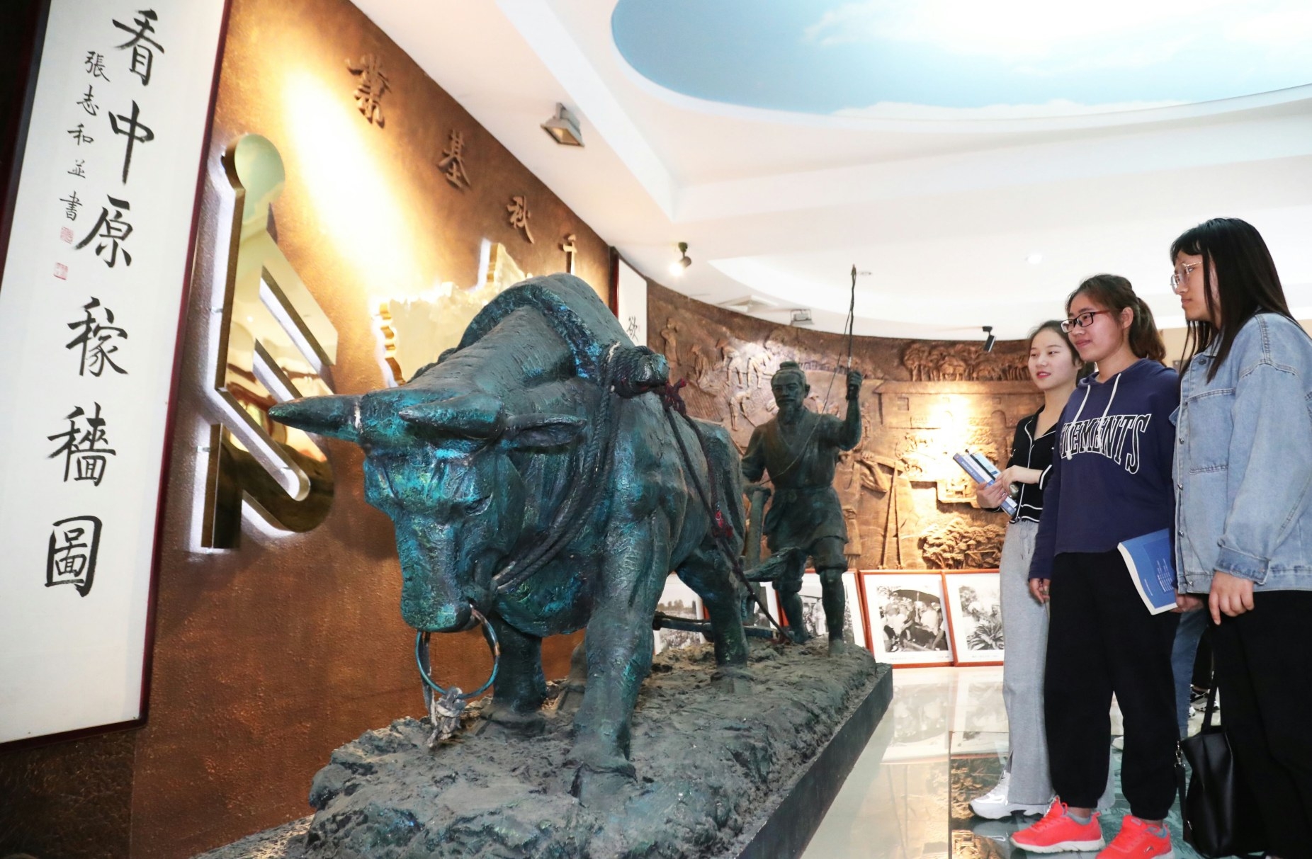 “欲知华夏农耕事,且看中原稼穑图”,一走进迎宾厅,这副对联赫然入目。馆内,一尊铁牛犁地的雕塑吸引了记者的目光。
