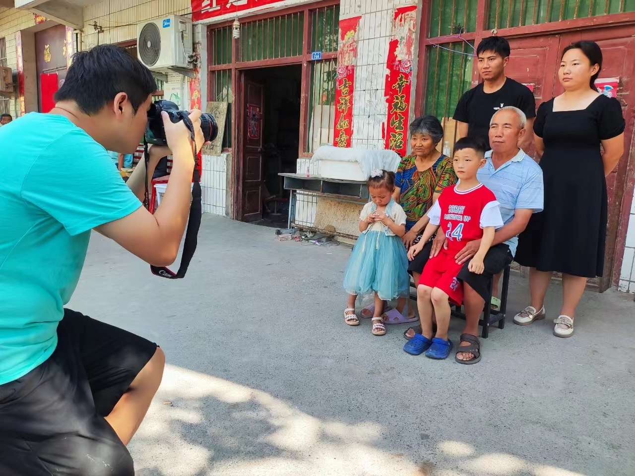 拉起一块红色背景布,前面放一个板凳,一个简易的室外摄影场地便搭建起来。在志愿者说明来意后,袁庄村的老人们热情高涨,纷纷上前跃跃欲试。不少老人很多年没有拍照了,面对镜头显得有些紧张与羞涩。村民袁天业显得与众不同,他整理好衣冠,端正坐着,目光炯炯地说:“我想拍得精神点,把照片寄给我女儿,她在深圳工作。”