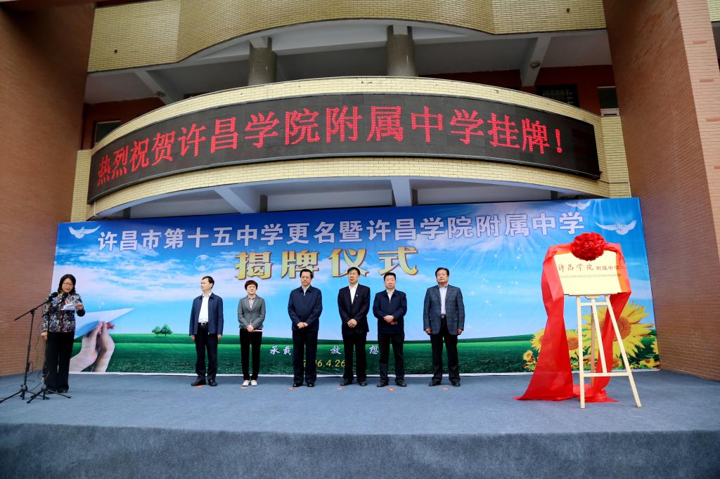 4月26日,许昌市第十五中学更名暨bet36体育在线附属中学揭牌仪式在十五中教学楼前举行。许昌市委书记王树山,市委常委、秘书长熊广田,市委常委、常务副市长石迎军,东城区党委书记朱发业,bet36体育在线院长赵继红出席仪式。市教育局、财政局、人社局、编办、东城区有关负责人员、部分学校教师学生代表、bet36体育在线相关部门负责人等参加仪式。揭牌仪式由许昌市副市长秦春梅主持。