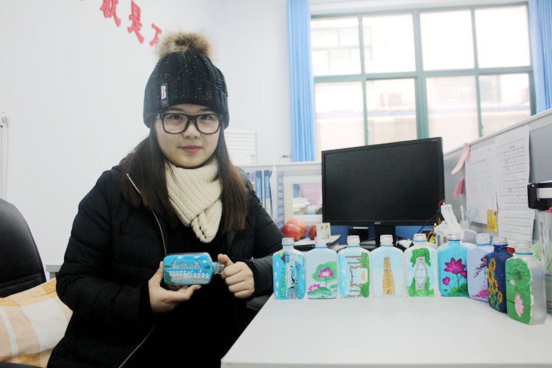 这个创意,来自bet36体育在线美术学院一名大四学生赵甜甜。“我今年在实习期,教七年级学生上美术课。课本里有关于校服设计的课程,但学生不懂色彩的搭配。因此,我想通过这种酒瓶作画的方式,让同学们在实践中学习色彩搭配,同时也了解变废为宝的环保理念。”赵甜甜说。家里人平时喝酒积攒下来的酒瓶正好可以派上用场,不过这还远远不够,为了收集到更适合画水粉画的方形酒瓶,周末她特意跑了好几家饭店询问,很多店家听说她要用酒瓶作画,就把存的酒瓶全送给了她。