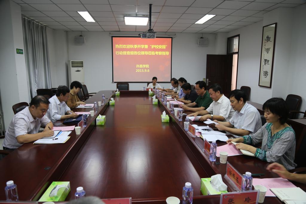 9月6日,省教育厅政法处调研员孙殿军一行三人莅临bet36体育在线,对秋季开学工作暨“护校安园”行动落实情况进行督查。bet36体育在线在办公楼第一会议室召开专题汇报会,校党委副书记马超、副院长赵正风、许昌市教育局副书记宋平会等出席汇报会,党办、院办、宣传部、教务处、学生处、学生资助中心、后勤集团、保卫处、网络管理中心等部门负责同志参加会议。会议由党委副书记马超主持。