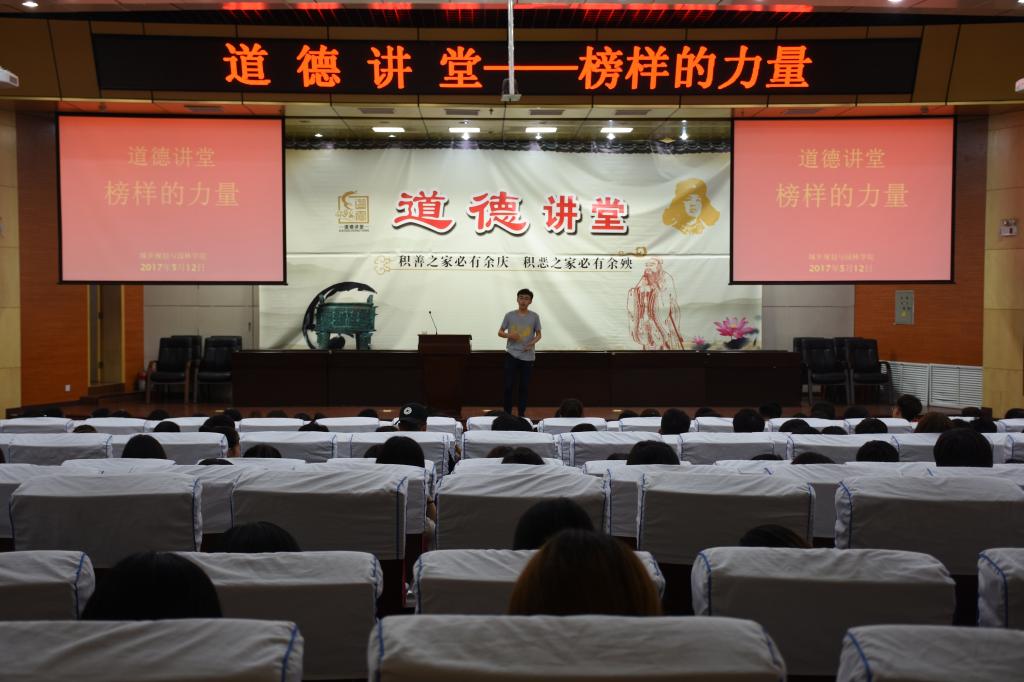 本次道德讲堂是为深入贯彻落实《公民道德建设实施纲要》,加强校园文明建设,提升全体师生的思想道德素养而举行的专题活动。活动使在场的每一位大学生认识到加强自身道德修养,提高自身职业道德素质的重要性,相信他们在以后的学习生活中都能找到自己的榜样,帮助他们在以后的生活中成为道德的学习者、传播者、实践者和受益者。(图片由城乡规划与园林学院提供)
