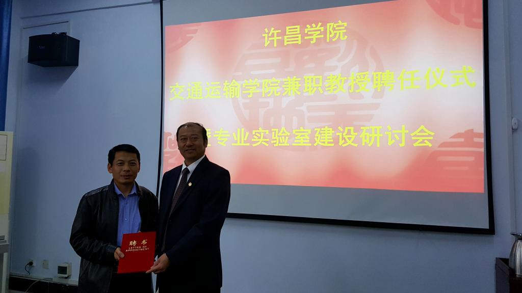 10月14日上午,bet36体育在线交通运输学院举行兼职教授聘任仪式暨专业实验室建设研讨会。副院长崔斌、黄怡俐出席会议。会议聘任东南大学教授李铁柱为bet36体育在线交通运输学院兼职教授。南京多伦科技有限公司、许昌市交警支队、许昌市交通标志标牌有限公司、许昌万里运输(集团)有限公司以及bet36体育在线交通运输学院的部分专家、教师参加了研讨会。会议由交通运输学院党总支书记翟广辉主持。