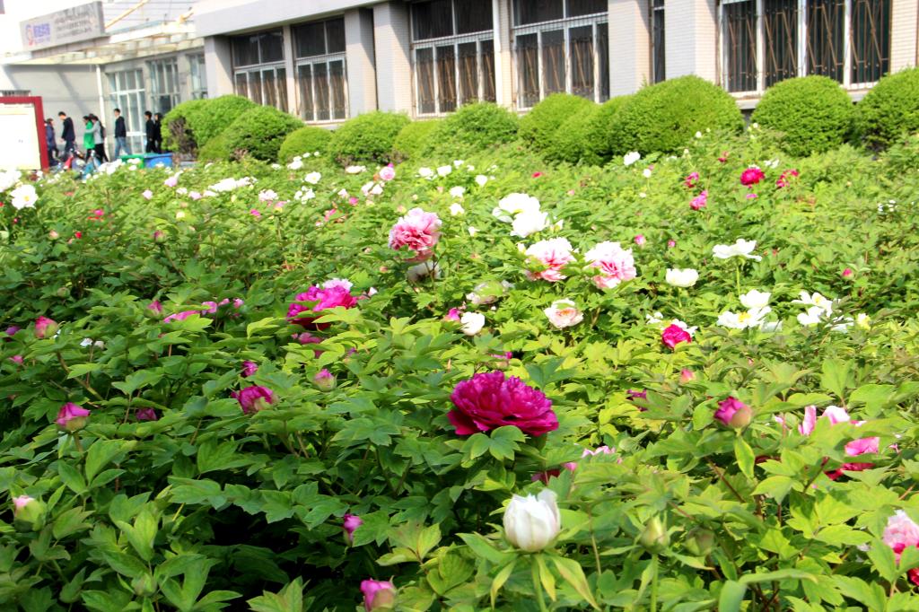 据了解,位于东西启智楼前的牡丹分别栽种于2006年和2014年,各1100余株,有状元红、紫薇、赵粉等十几个品种,目前陆续进入盛开期。