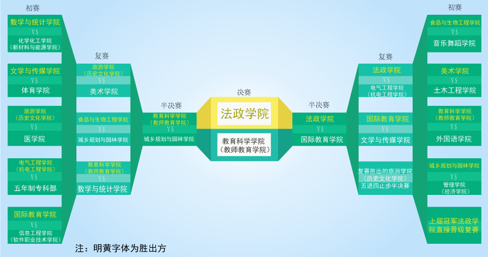 赛场激烈,法政学院代表队最终卫冕冠军,教育科学学院(教师教育学院)获得亚军,城乡规划与园林学院和国际教育学院并列季军。文学与传媒学院和历史文化学院(旅游学院)等六支代表队分获“优秀组织奖”。校党委副书记马超与600余名师生一起观看了决赛,并为获奖师生颁奖,党委宣传部部长潘春彩、校团委书记张鹏辉等相关部门负责人也到场观看。
