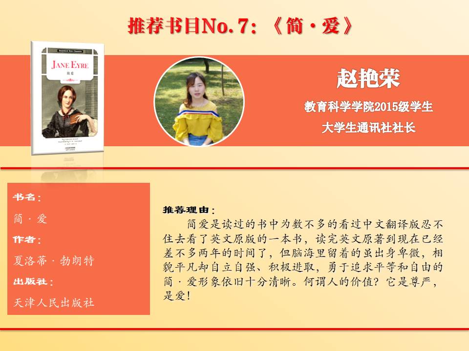 【编者按】为进一步激发全校师生爱读书、会读书、读好书的浓厚兴趣,努力营造书香校园的良好氛围,校党委宣传部(新闻中心)今年继续策划推出荐书专题活动。本期“师长荐书”和“学长学姐荐书”专题活动,特别邀请8位教师和8位同学精心推荐图书16本,在学校官方网站、官微等平台同步推送,敬请关注。