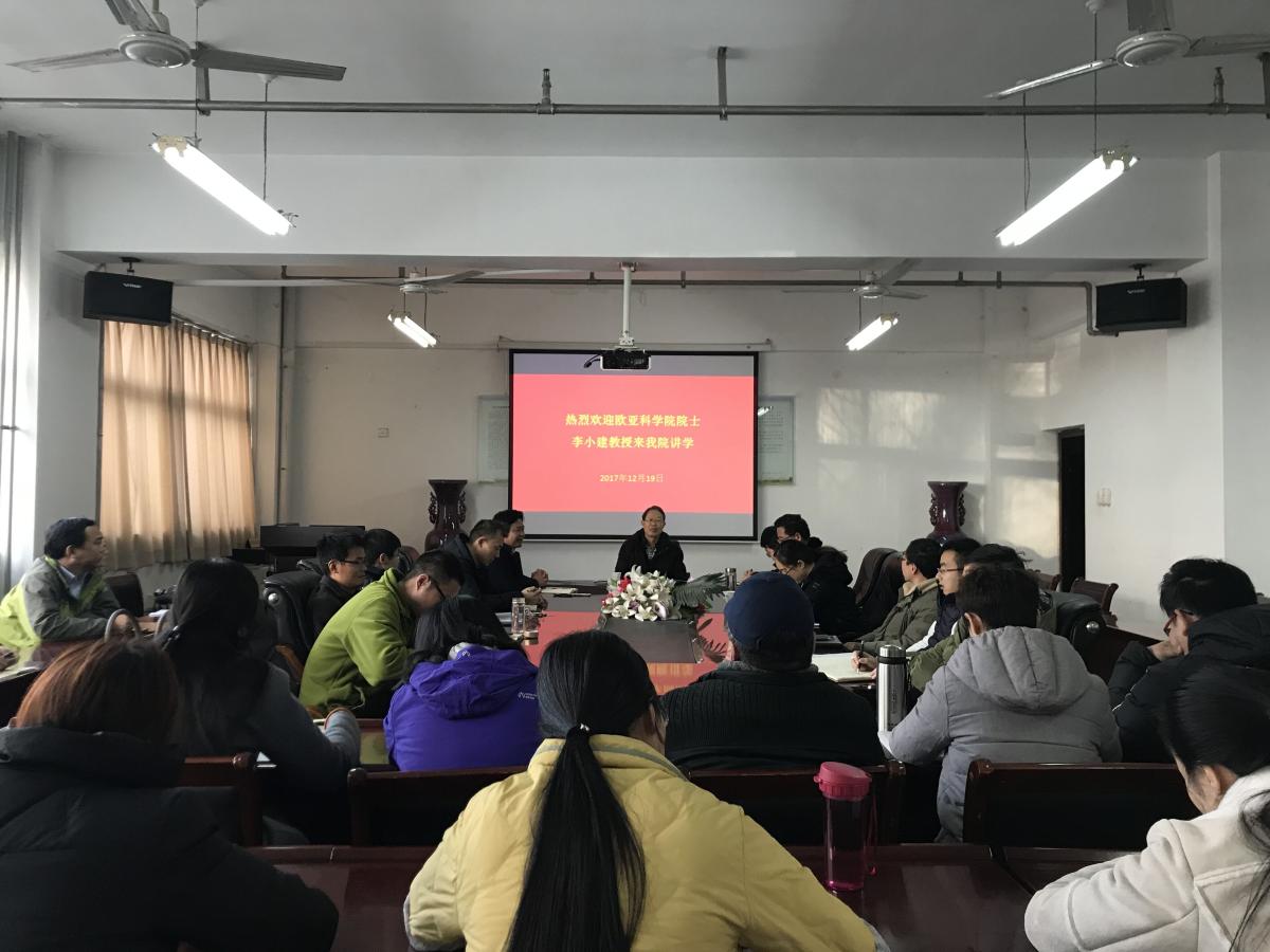 12月19日下午,国内著名经济地理学家,欧亚科学院院士,全国经济地理研究会副会长,河南大学区域经济学、人文地理学博士点第一带头人,原河南财经政法大学校长李小建教授应邀来我校作了题为“科学问题凝炼与国家自然基金申请”学术报告,报告由城乡规划与园林学院院长吴国玺主持。