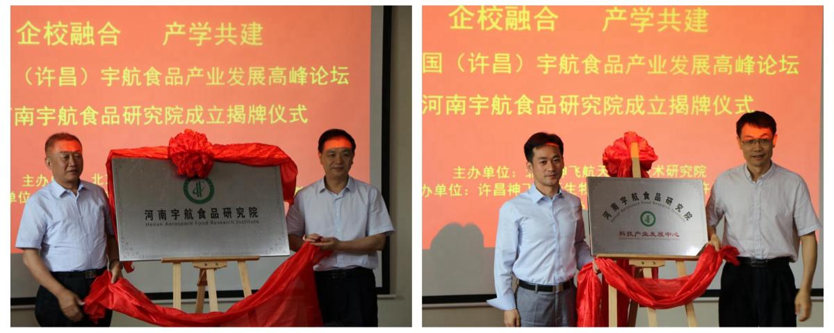 仪式上,中国航天科技集团有限公司航天育种研究中心总工程师曲建伟和许昌市政府副市长刘胜利共同为“河南省宇航食品研究院”揭牌,鄢陵县副县长赵峰和bet36体育在线副院长郑直共同为应邀“河南省宇航食品研究院科技发展中心”揭牌。(图片由食品与生物工程学院提供)