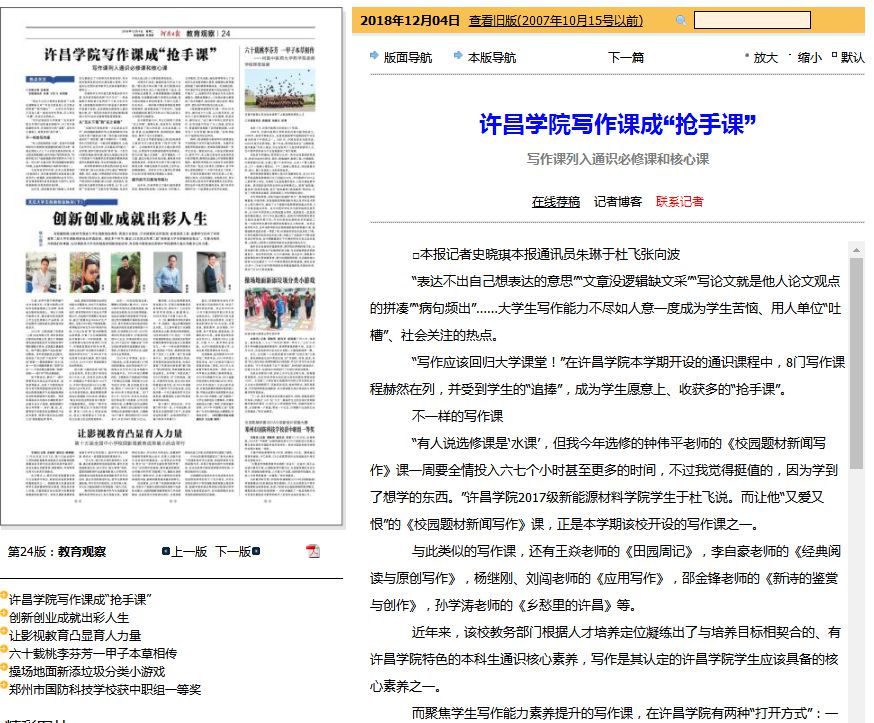 “克服写作恐惧的唯一方法就是去写作”,《校园题材新闻写作》主讲老师钟伟平向记者介绍了她的这门课,“我们最大的突破是采用了‘项目制’,整个学期作为一个周期,学生们共同完成一个既定的课题项目,让他们在学中写,在写中学,从而提高他们的写作能力。”这学期同学们要完成的“项目”是一个名为“许院听课录”的专题,要求大家通过寻访各个学院勇于开展教学改革创新的教师和深受学生喜爱的课堂,并写出系列报道文章。