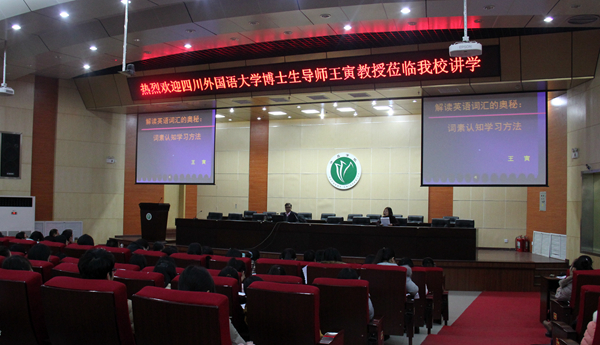 下午,王寅教授在学术报告厅为学生作了题为《解读英语词汇的奥秘:词素认知学习法》的讲座。王教授从语言与语言学的定义入手,肯定了词素认知学习的重要性;在对词汇量的标准、传统词汇学法进行批判与释解的基础上,提出了利用认知语言学展开的词素教学。王寅教授的讲座理论联系实际,引经据典,深入浅出,风趣幽默,启发了师生创新性的思维方式和研究思路。