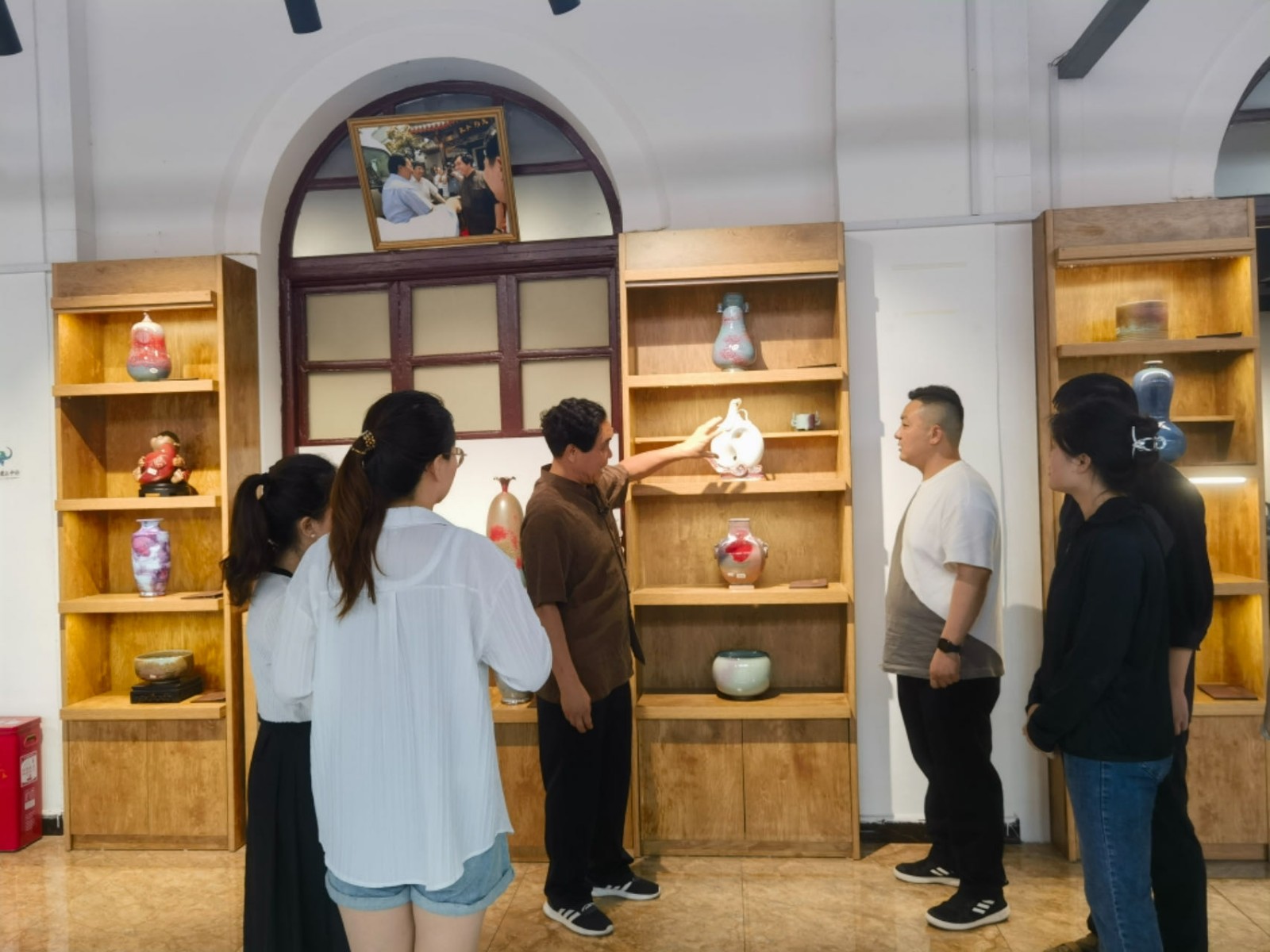 课程在线上开课同时,也在线下不断挖掘课程的深度与厚度。老师多次带领学生走进瓷区,应用田野教学法开展教学。今年暑假,钧瓷设计课的师生们再次来到神垕古镇“拜师学艺”,感受钧瓷文化的博大精深和源远流长。师生走访孔家钧窑、金鼎钧窑等课程实习基地,在学习钧瓷知识的同时了解当下钧瓷的发展状况。